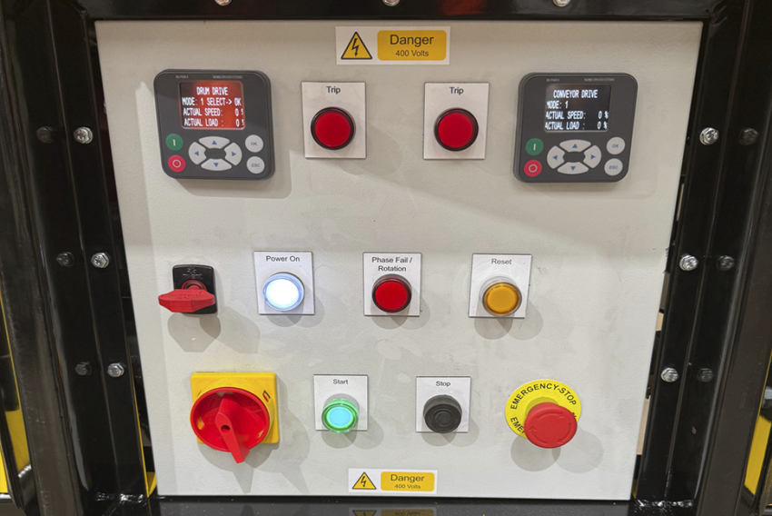 Le TROMMEL à deux fractions Red Rhino est équipé d’une trémie de réception, d’un tambour de criblage et de deux moteurs électriques puissants et réglables. La structure du châssis en acier thermolaqué est dotée de pieds de support réglables en hauteur.